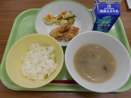 8月31日(火)の献立は、ごはん・牛乳・鶏肉の米粉揚げ・コールスローサラダ・なすのみそ汁でした。