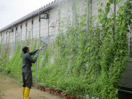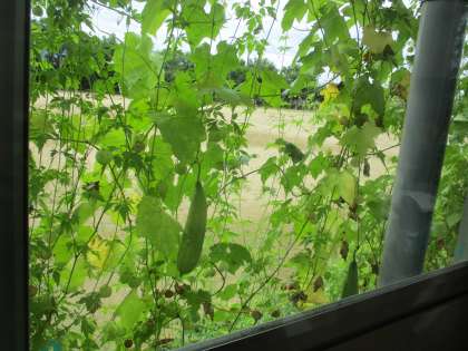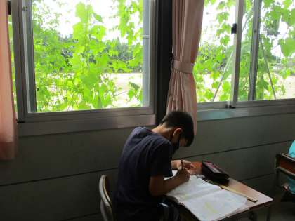グリーンカーテンで日ざしを遮り、学習に励んでいます。