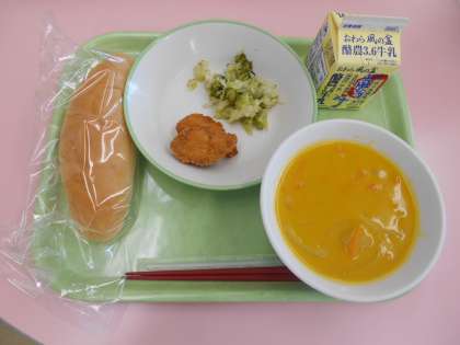 9月6日(月)の献立は、コッペパン・牛乳・チキンナゲット・フレンチサラダ・かぼちゃポタージュでした。