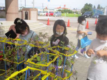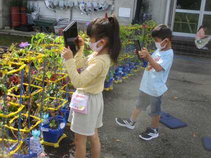 あさがおの写真を撮り、1学期との違いも観察しています。