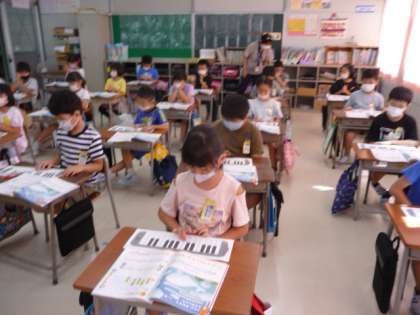 9月13日(月) 2年生 音楽 紙の鍵盤ハーモニカで練習