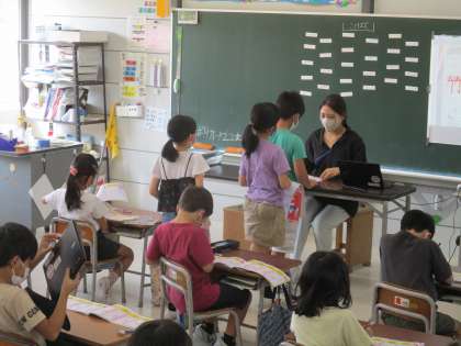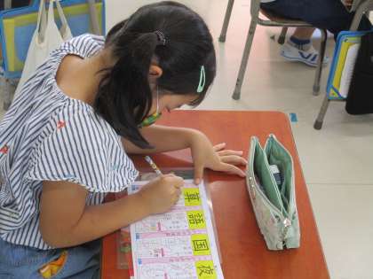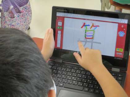 漢字の正しい筆順でパソコンの画面を指でなぞります。