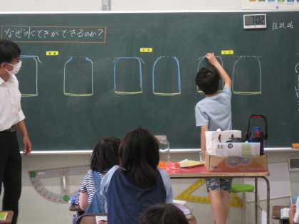 理科では、水滴はどうしたらできるのか、予想し実験して確かめました。