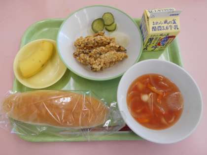 9月27日(月)今日の献立は、米粉コッペパン・牛乳・きびなごのさくさく揚げ・かぶのサラダ・トマトスープ・バナナでした。