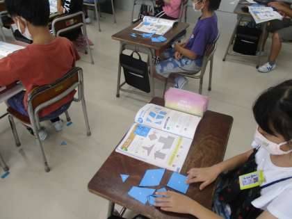 算数科では、三角や四角の形について学習しています。教科書をよく見ながら同じ形になるように組み合わせています。