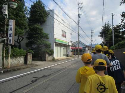 ポイントで立ち止まり、先生からの説明を聞きます。町に根付いた病院や、川や田んぼを見つけました。昔と今の写真を見比べます。