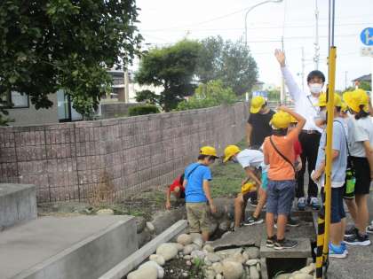 安全に気を付けながら、用水路を流れる水を近くで見ています。