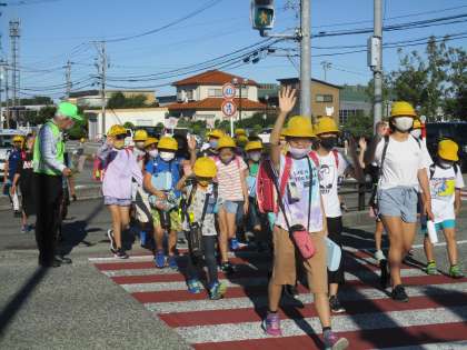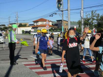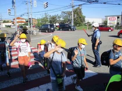 地域の方、警察官が子供たちの安全を見守っておられます。
