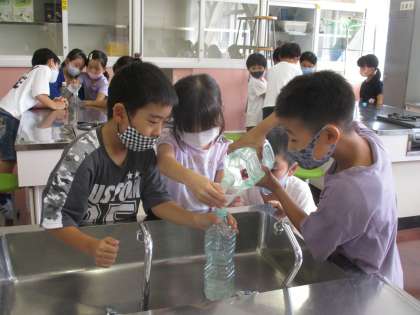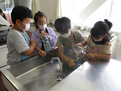 家庭科室へ行って、実際にペットボトルに水を汲み、水のかさを比べました。