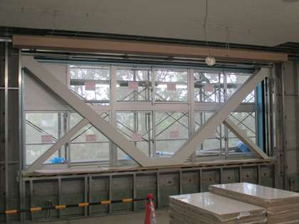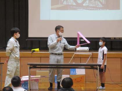 次は、SDGs11「住み続けられるまちづくりを」の視点から、耐震工事の内容を模型を使って、変形しやすい四角形の中に、三角形の構造物をはめ込む耐震構造を学びました。