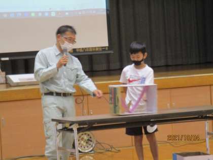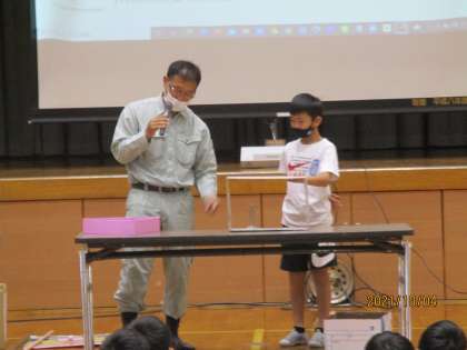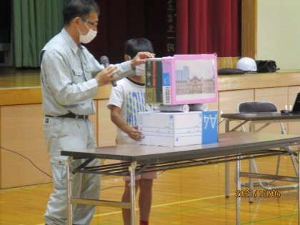 大久保小学校は、三角の枠を入れることで丈夫な校舎になることを、模型を使って説明しています。