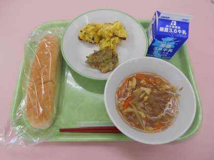 10月11日(月)の献立は、米粉コッペパン・牛乳・鱈の香草焼き・チーズおさつ・春雨スープでした。