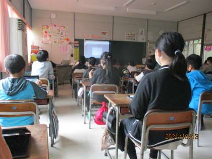 昼休みに児童総会がありました。児童会目標について1学期の活動を振り返り、各委員会委員長からのメッセージを聞いた後、パソコンのクラスルームからアンケートに答えました。その結果を待っているところです。