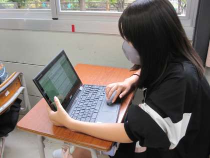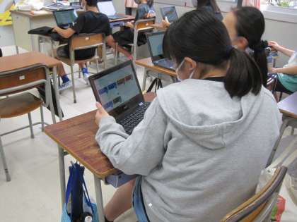 委員長からのメッセージを聞き、児童会の目当てについて考えたこと・思ったことを、端末を使ってタイムリーに打ち込んでいます。