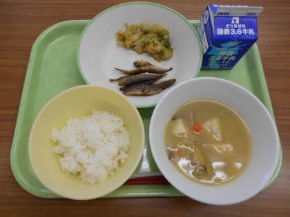 10月18日(月)の献立は、ごはん・牛乳・小あじの唐揚げ・ごま和え・さつま汁でした。