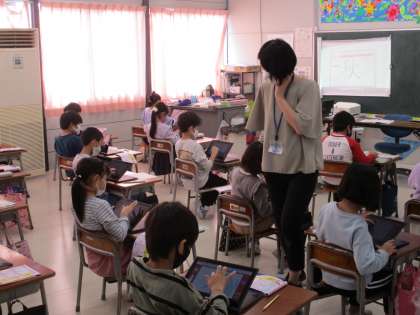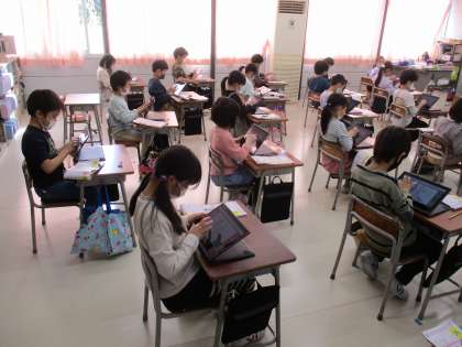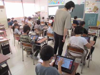 パソコンで漢字の練習です。正しい書き順を指でなぞります。
