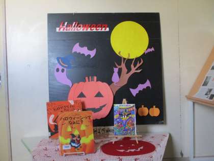 現在、耐震化補強工事のため図書室が狭くなっていますが、図書室は秋が感じられる空間になっています。