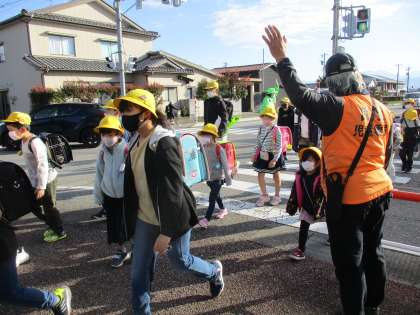 地域の方が、子供たちに挨拶しながら、見守っておられます。 ありがとうございます。