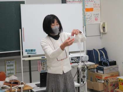 写真は、お話の中で出てきた綿の実物を見せてもらっているところです。