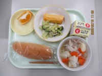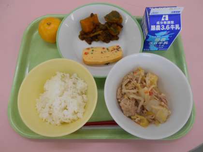 10月26日(火)今日の献立は、ごはん・牛乳・千草焼き・かぼちゃのいとこ煮・白菜なべ・みかんでした。