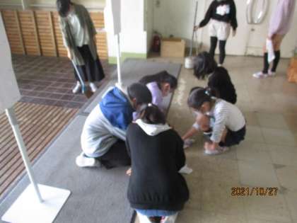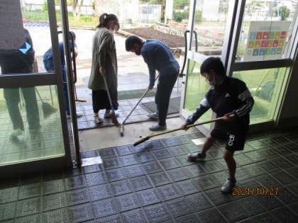 体育館の準備が終わったところで、お客さんをお迎えする玄関の汚さに気付き、みんなで掃除をしました。普段できない細かいところまで徹底的に行っていました。その集中力とやる気に感服しました。