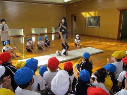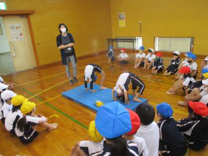 今日の体育では、マット運動を行い、アンテナやブリッチ、前転の練習をしました。先生のお手本や得意な子のお手本を参考にして挑戦していました。