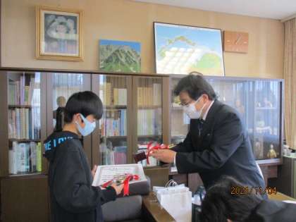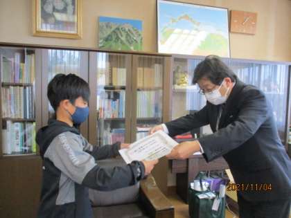 引き続き、花と緑の標語コンクールで受賞した3年生1名、6年生1名、5年1名を表彰しました。