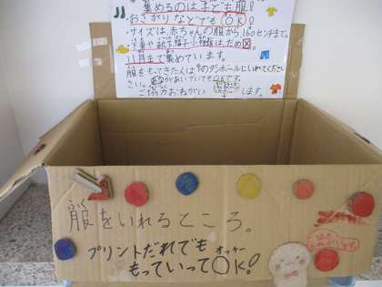 4年生は、世界の難民の子供たちに届ける子供服を集める活動をしています。子供服は段ボール箱5箱になりました。