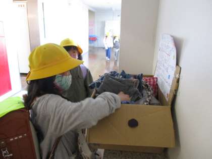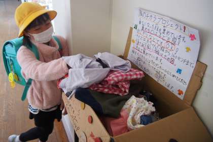 4年生が取り組んでいる「服のチカラプロジェクト」に協力するため、昨日・今日と家にある使わなくなった子供服をたくさん持ってきていました。段ボールが服でいっぱいになっていました。