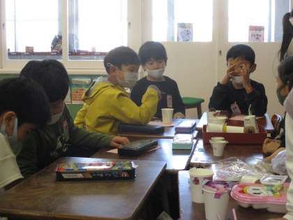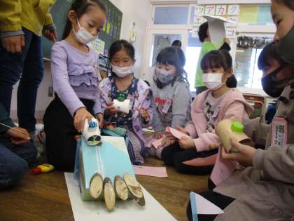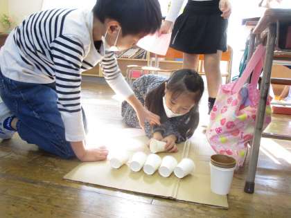 あきとなかよし1組ランドを楽しんだ2組と3組の子供たちは、「私たちも2・3組ランドを作りたい」とつぶやき、グループごとに分かれて、あきのおもちゃ作りをしています。