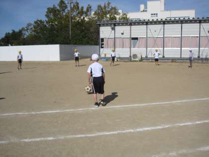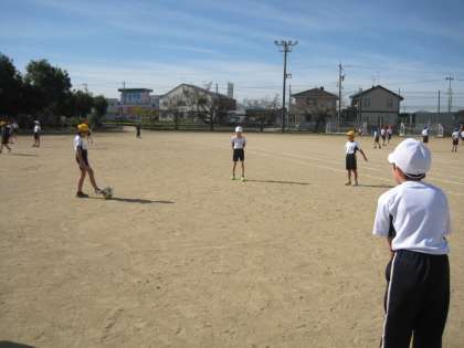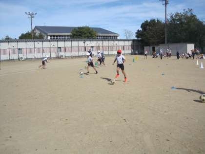 体育では、サッカーボールを使って、ボールを蹴る練習をしています。円になって練習した後、コーンをよけながら蹴る練習をしました。青空の中、気持ち良さそうに練習していました。