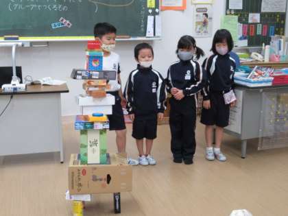 キリンや滑り台等、様々なものが出来上がりました。写真は、タワーをつくったグループです。タワーが倒れないように、足の部分を同じ高さになるよう工夫していました。
