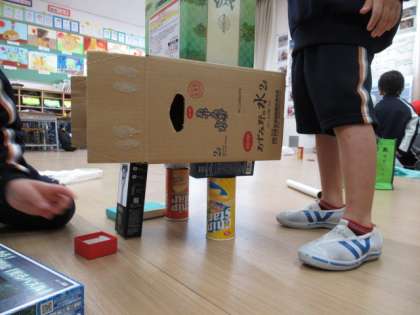 今日は、各自持ってきた箱を使って、グループでいろいろなものをつくりました。