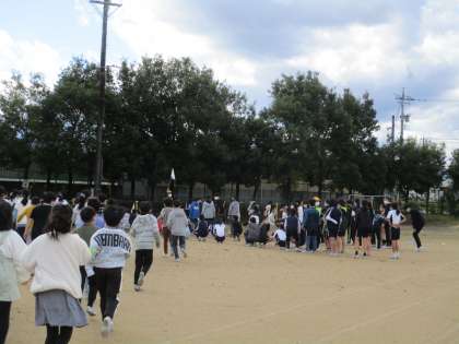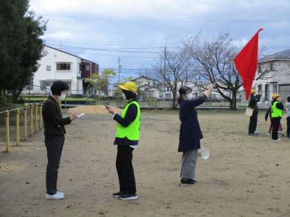 はじめに、家庭科室での出火を想定した教職員の初期消火訓練、119番通報訓練、避難誘導訓練や児童の避難訓練を行いました。