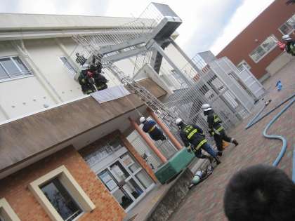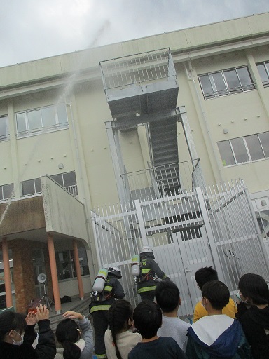 避難訓練が終わった後に、大沢野消防署の方に消防訓練を見せていただきました。