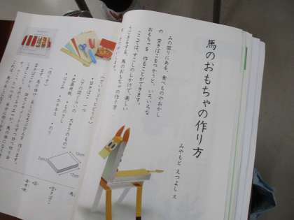 国語の教科書にある説明文「馬のおもちゃの作りかた」を読んで、実際に馬のおもちゃを作っているところです。説明文をしっかり読み取る必要性が感じられる授業です。