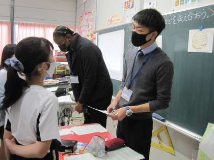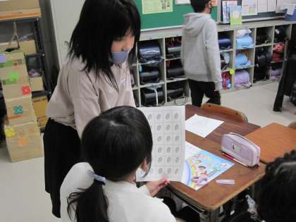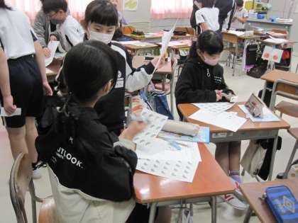外国語の学習では、外国語でほしい果物と個数を伝えて受け取る学習をしました。もらった果物は、パフェの具になるようです。とても楽しそうに外国語で会話をしていました。