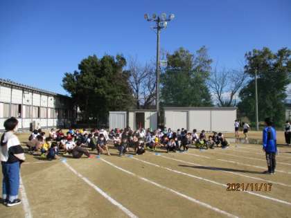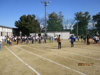 秋晴れのさわやかな天候の下、運動委員会主催で「ダッシュ王選手権」を行いました。以下は順に開会式、準備運動、1年生男子の決勝戦の様子です。