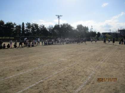 上から順にグラウンドで応援している子供たちの様子、閉会式の様子です。走り終わった後はみんなすがすがしい顔をしていました。これから天候も悪くなって外で運動することがなかなかできなくなりますが、晴れた日にはグラウンドで思いっきり運動を楽しみたいですね。6年生男女の決勝戦は明日18日に行います。楽しみにしてください。