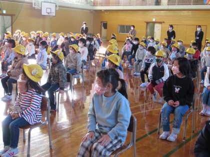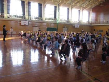 子供たちは、とても楽しみにしています。下校の前に、体育館に椅子を入れて、観劇の準備をしました。感染対策のため、前後左右の椅子の間隔をしっかりとっています。