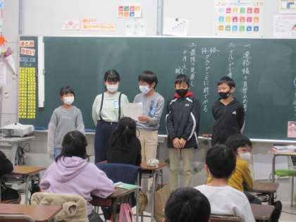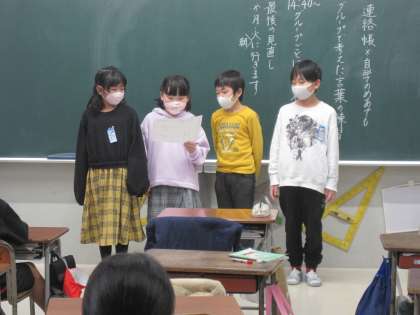 11月26日(金) 4年生 服のチカラプロジェクト1 公開日 2021/11/26 更新日 2021/11/26 2023年度 4年生 今日で、服の回収は最終日となりました。最後の最後まで多くの子供服が集まりました。子供達は、協力してもらった各学年へお礼を言いに行くために、練習をしています。