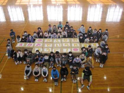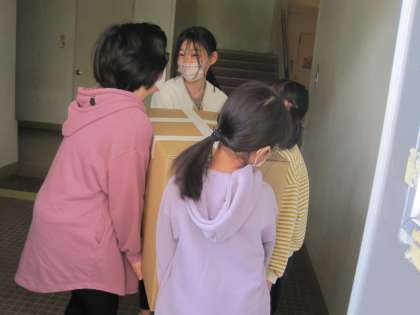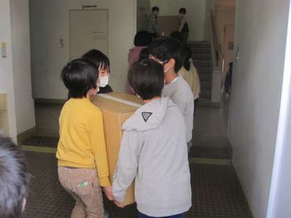 集めた19箱の段ボール箱を協力して運び、体育館に並べました。1箱1箱、重たさを実感しながら運びました。最後は、予想以上に集まった段ボール箱と一緒に記念撮影をしました。