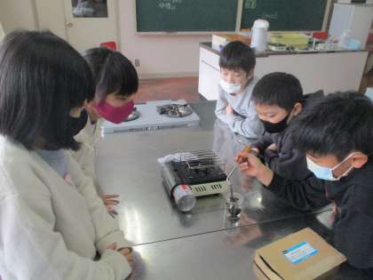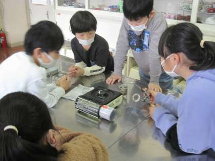 理科では、金属が温まると体積はどうなるのか実験しました。