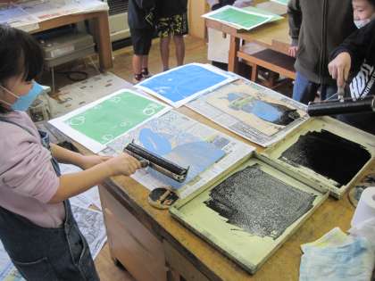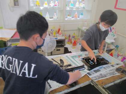 青色・緑色・黄色に黒色が際立って、どれもとてもよい作品に仕上がりました。題名を付けて完成させるのが楽しみな子供達です。