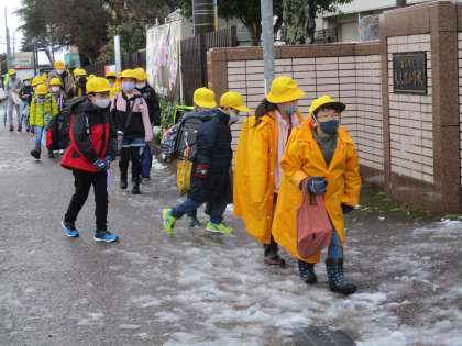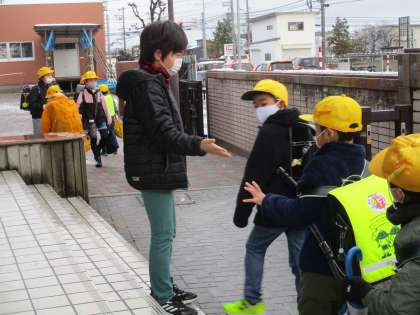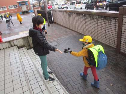 委員会の子が、「挨拶ジャンケン」で出迎えます。