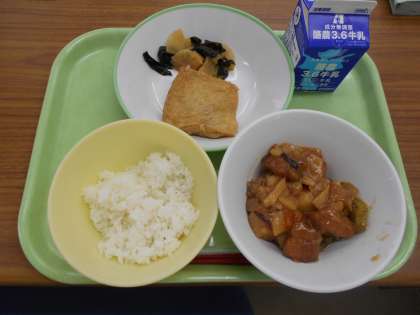 酢豚は、おいしくて、食べるとあっという間になくなりますが、完成するまでの作業工程が多く、調理員さんは、とても大変です。油でじゃがいもを素揚げし、その次に、下味を付けた豚肉を揚げます。大きな釜で、玉ねぎ、にんじん、干し椎茸、たけのこ、を炒めて味付けし、じゃがいもと豚肉を混ぜます。最後にピーマンを入れてできあがりです。酢豚は、野菜とお肉が同時に食べられ、栄養満点の料理です。今日もおいしく作ってくださった調理員さんに感謝していただきました。