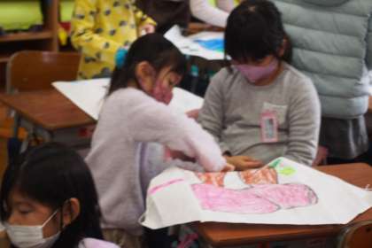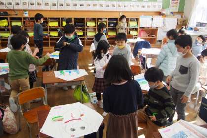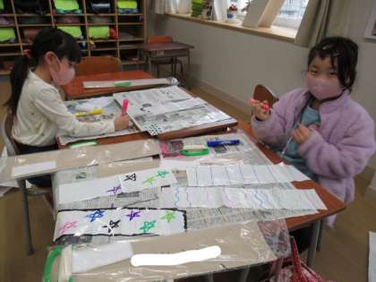 12月21日(火) 1年生 凧作り 公開日 2021/12/21 更新日 2021/12/21 2023年度 1年生 凧を揚げるために、あしやたこ糸を付けて仕上げをしています。 友達と協力しながら活動していました。