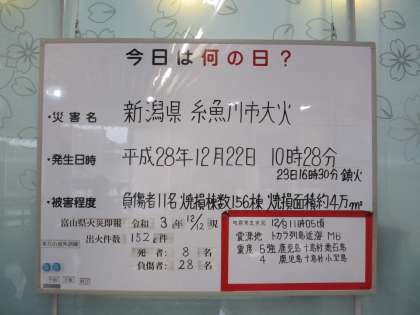 12月22日(水) 3年生 校外学習 四季防災館(9) 公開日 2021/12/22 更新日 2021/12/22 大久保っ子ニュース 平成28年の今日(12月22日)は、新潟県糸魚川市大火が発生した日です。 今日は、災害についてたくさん学ぶことができました。いつ起きるか分からない災害に備えておく必要性を痛感する半日でした。 四季防災館の職員の皆様、ありがとうございました。