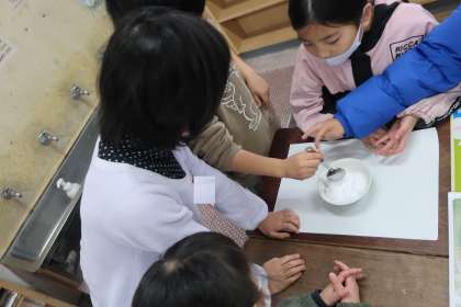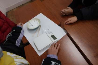 砂糖と塩の重さを比べるときには、同じ量にする際、「すり切る」ということを覚えました。へらを使って上手にすり切り、実験をしていました。重さが違うことに気付いたとき、「同じ1kgでも、塩の方が袋が小さかったよ。塩の方が中身がぎゅっと詰まっているのかもしれない」等、自分なりにそうなる理由を考えていました。