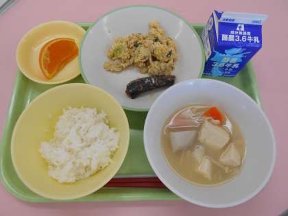 12月23日(木)の献立は、ごはん・牛乳・いわしの梅煮・卵とチンゲンサイの炒め物・いものこ汁・あいかでした。